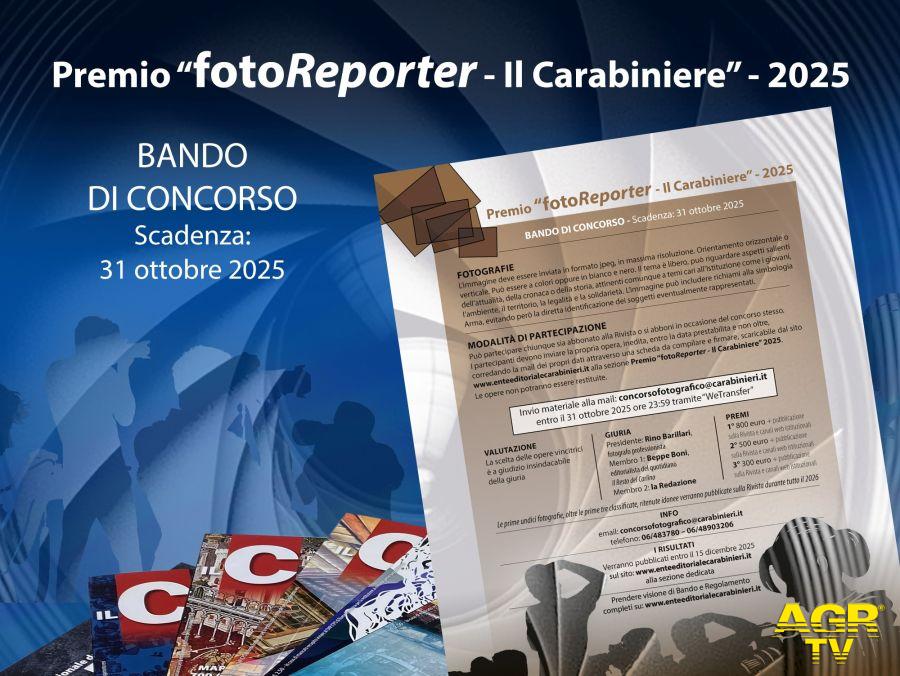 (AGR) E’ ancora aperto fino al 31 ottobre 2025 il Concorso fotografico FotoReporter 2025 della Rivista “Il Carabiniere”, il prestigioso mensile dell’Arma dei Carabinieri che tratta di attualità, storia, arte, medicina, geopolitica, e racconta la vita, la quotidianità del Paese, con grazia e lontano da posizioni ideologiche. Partecipare a FotoReporter è molto semplice: basta essere abbonati o abbonarsi contestualmente e inviare per mail la propria opera fotografica in alta risoluzione all’indirizzo concorsofotografico@ilcarabiniere.it.