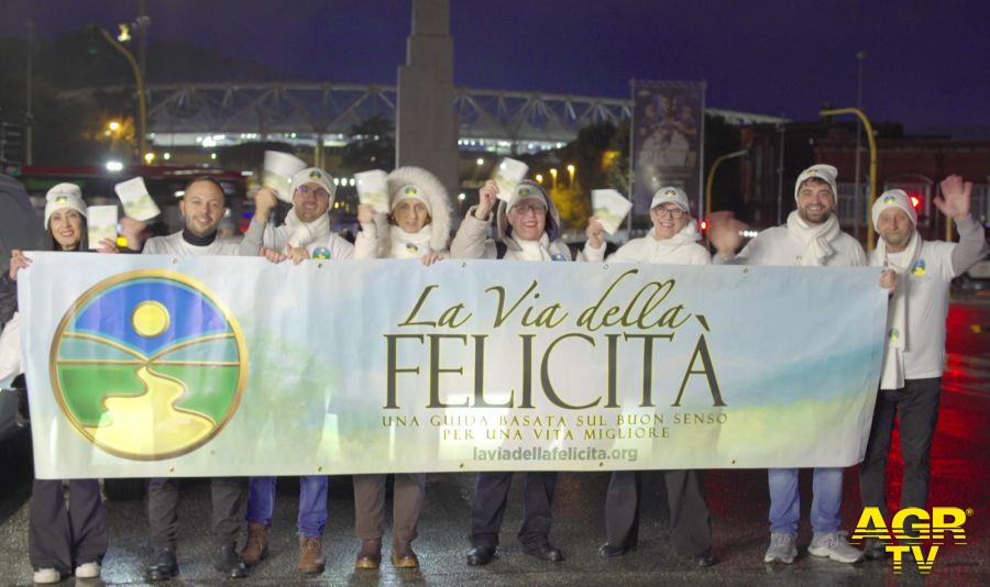 (AGR) La pioggia non ha fermato la gentilezza….Ieri, infatti, 25 gennaio, durante Roma–Milan allo Stadio Olimpico, 30 volontari de La Via della Felicità hanno distribuito 5.700 opuscoli portando un messaggio di rispetto, responsabilità e convivenza civile. Molti tifosi si sono fermati a chiedere informazioni e alcuni, colpiti dal significato dell’iniziativa, si sono uniti ai volontari per aiutare nella distribuzione.