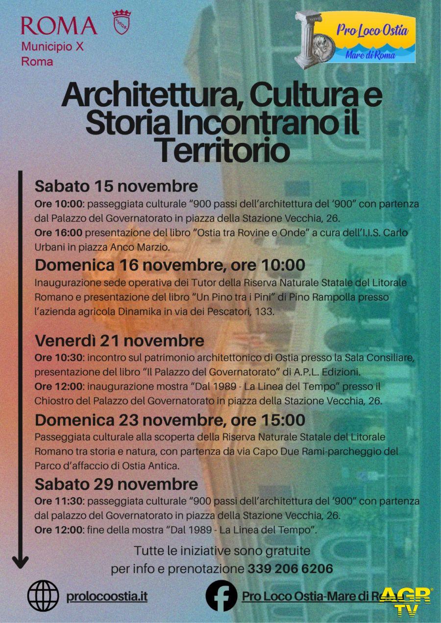 L’iniziativa “Architettura, Cultura e Storia Incontrano il Territorio” prevede una serie di appuntamenti tutti gratuiti nei prossimi fine settimana per concludersi il 29 novembre, e prevede, nello specifico: passeggiate culturali, presentazioni di libri sul territorio, una mostra: “Dal 1989, la linea del tempo” (dal 21 al 29 novembre nel Chiostro del Palazzo del Governatorato), escursione nella Riserva Naturale Statale del Litorale (partenza da Ostia Antica, via Capo Due Rami – Parco d’affaccio sul Tevere).